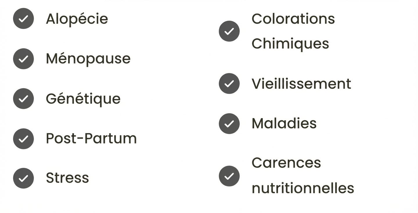 La chute de cheveux peut avoir de nombreuses origines : hormones, stress, grossesses, ménopause, colorations ou encore mode de vie.
