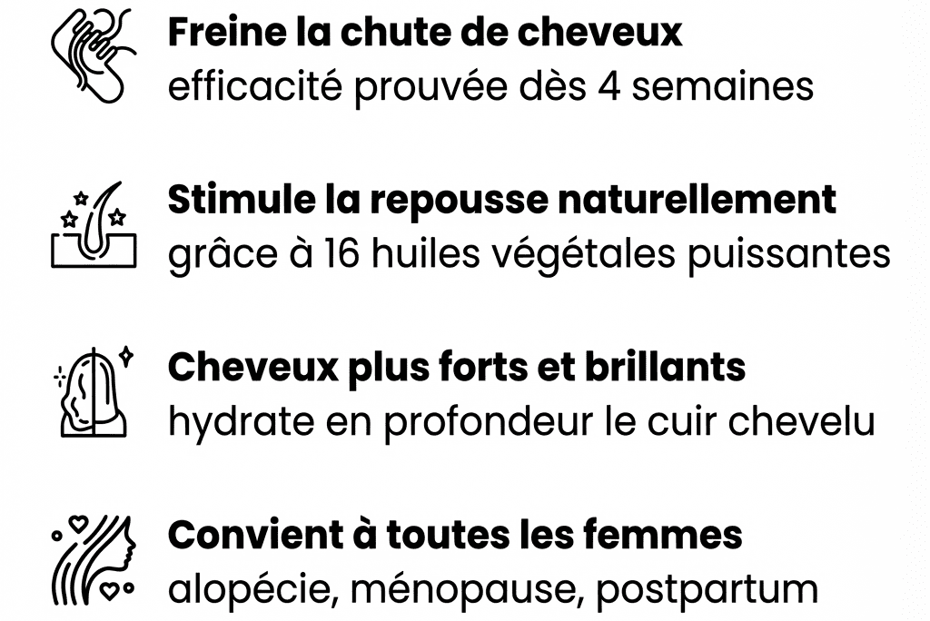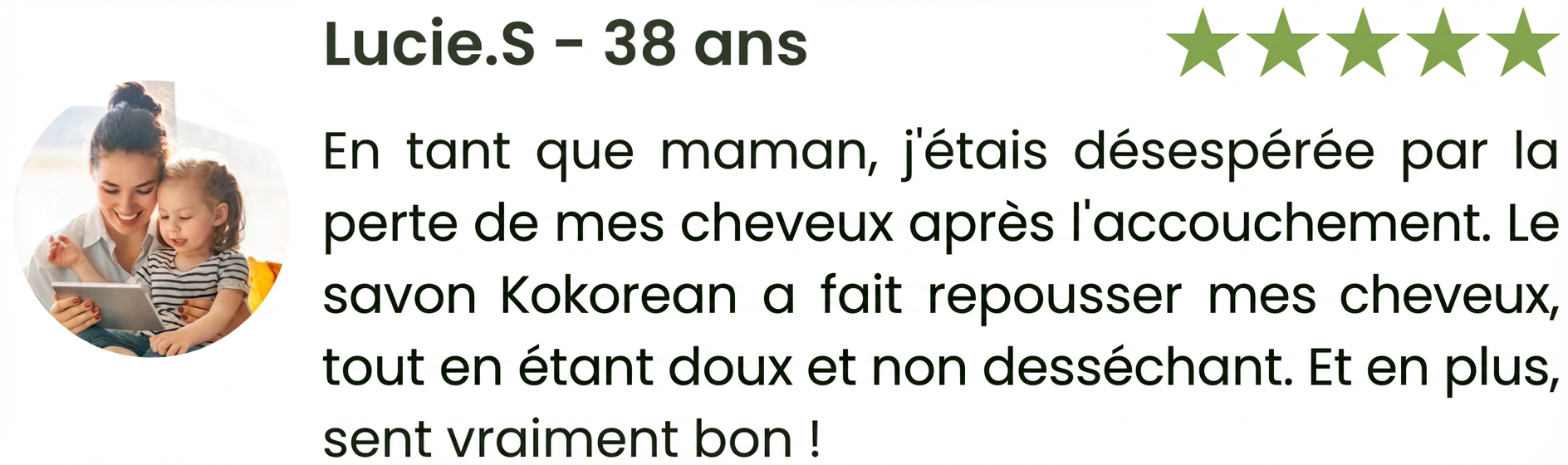 Après ma grossesse, une chute de cheveux terrible. En trois semaines avec ce shampoing, ça va déjà mieux, moins de perte et plus de volume