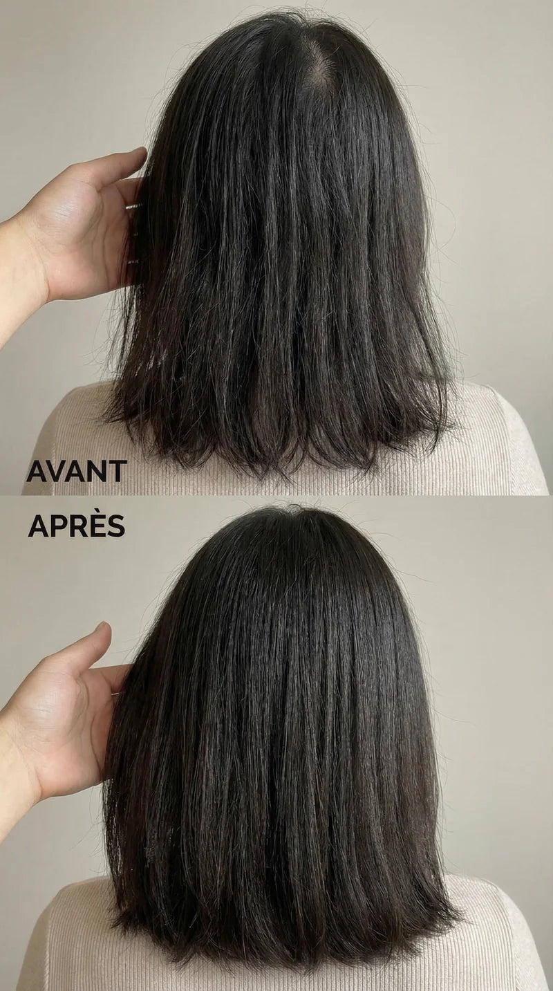 Vous commencez la cure Kokorean. Vos racines sont nourries en profondeur, le cuir chevelu retrouve de la vitalité.